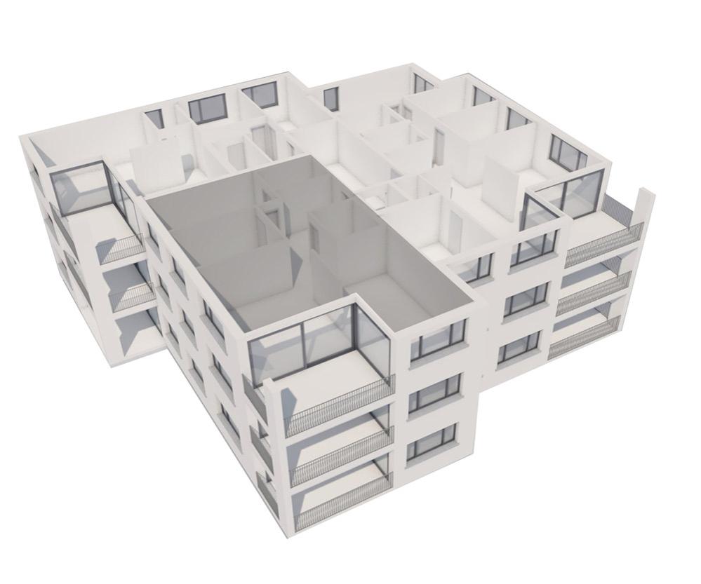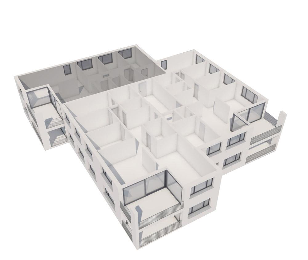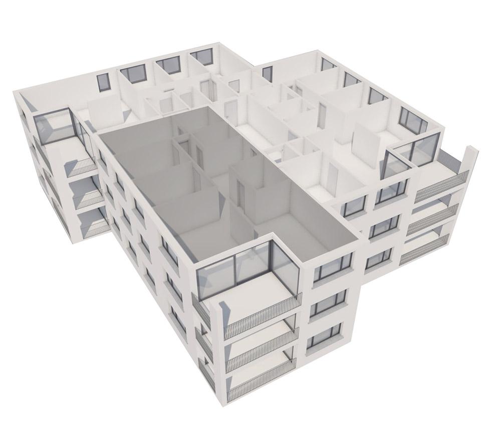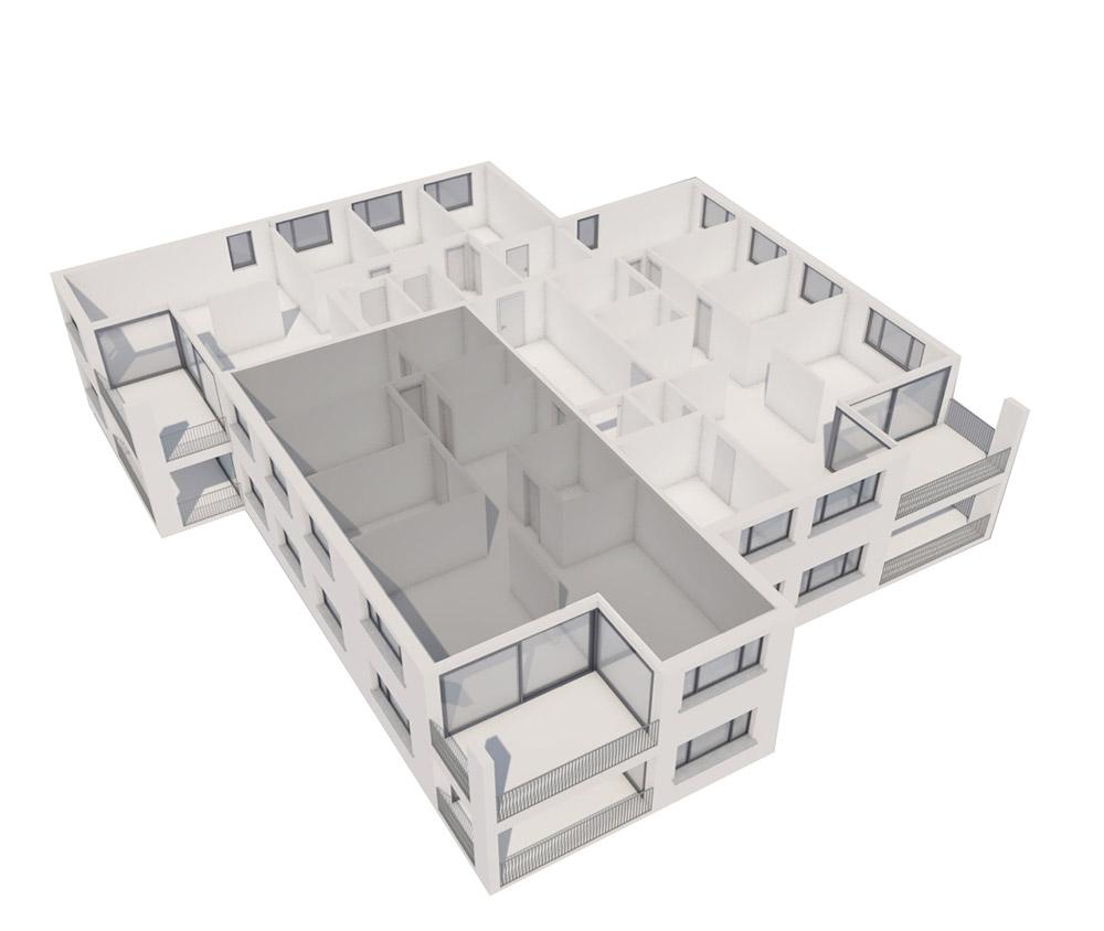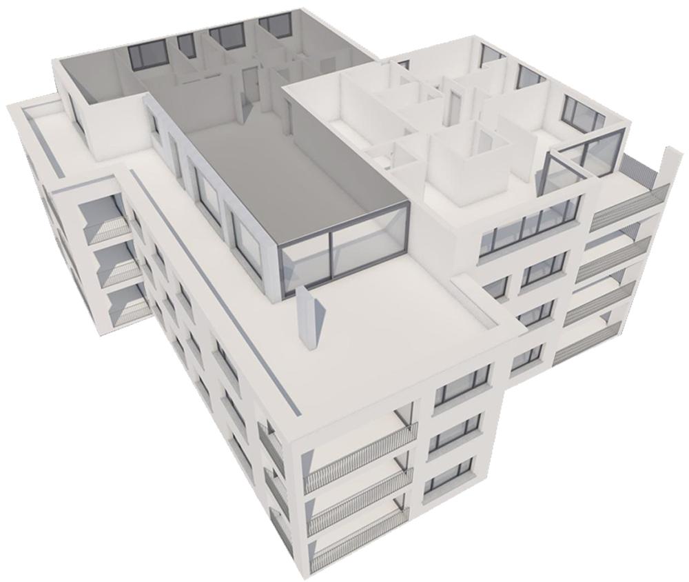 Der Flachdachaufbau wird als Warmdach konstruiert. Die Abdichtungen werden auf Bitumenbasis ausgeführt. Terrassenflächen werden mit Feinsteinzeugplatten 60/60cm belegt, nicht begehbare Flachdachflächen mit extensiver Begrünung.