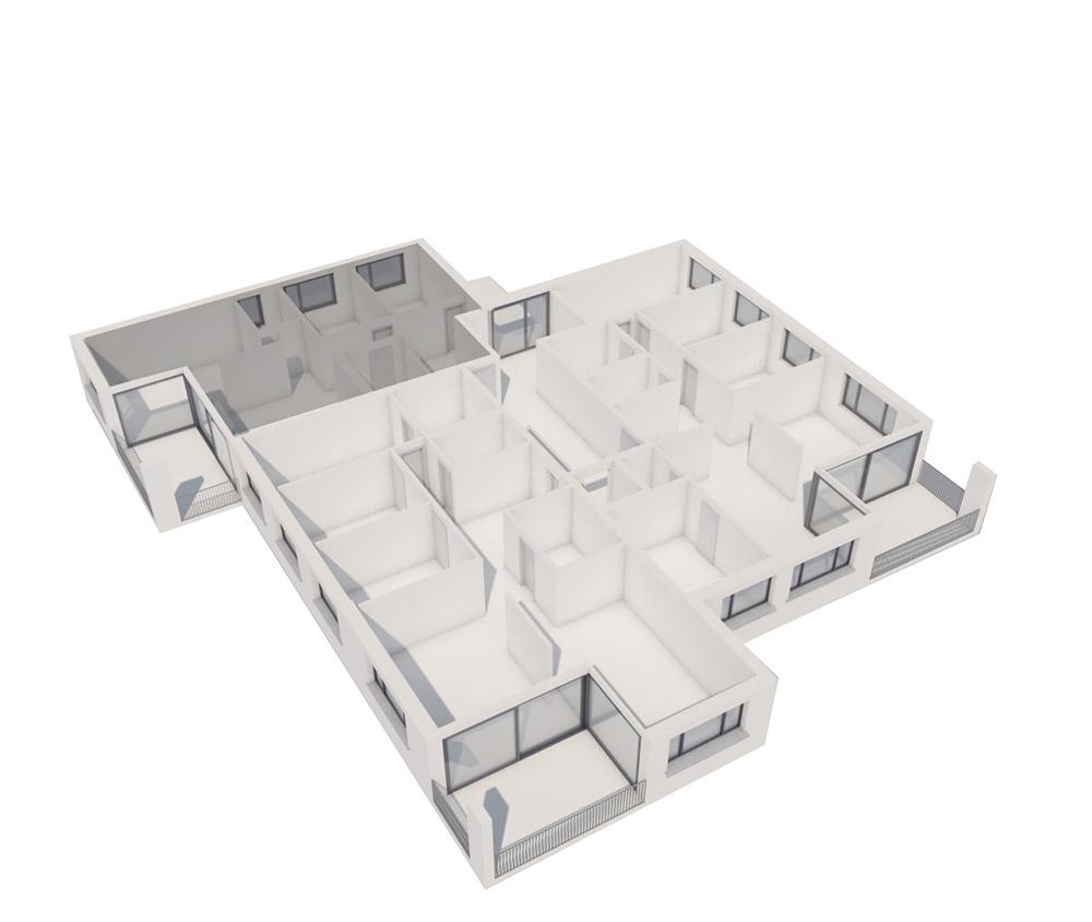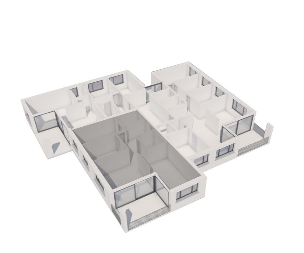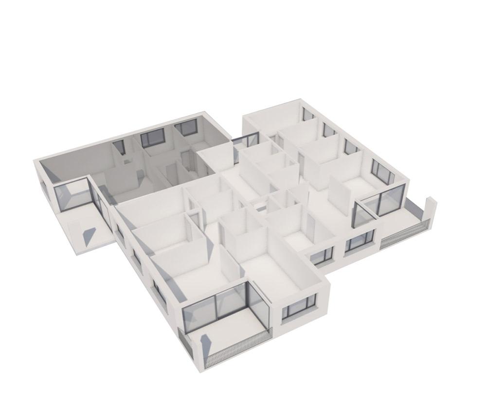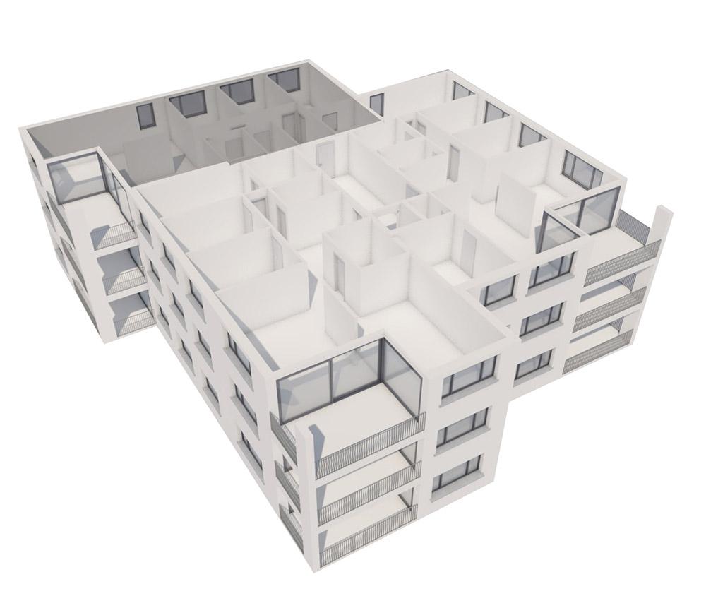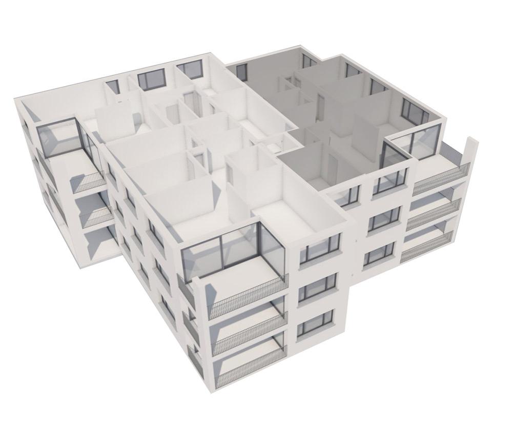 Der Flachdachaufbau wird als Warmdach konstruiert. Die Abdichtungen werden auf Bitumenbasis ausgeführt. Terrassenflächen werden mit Feinsteinzeugplatten 60/60cm belegt, nicht begehbare Flachdachflächen mit extensiver Begrünung.