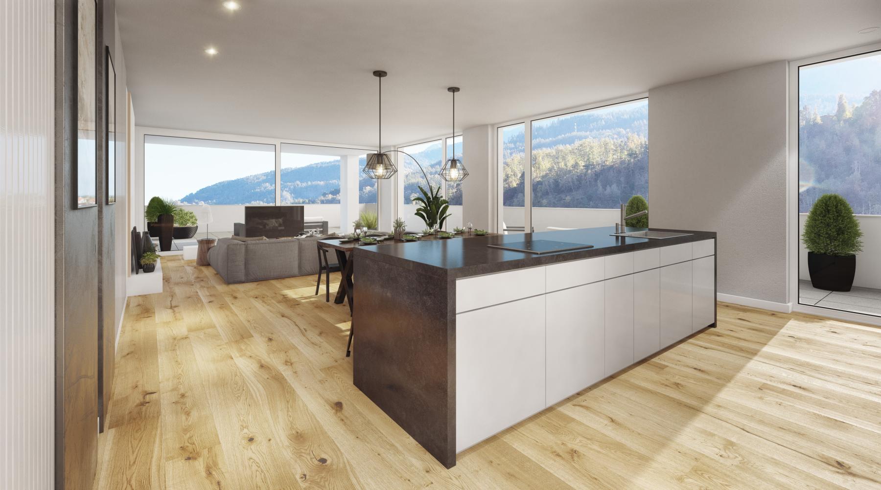 Erfreuen Sie sich am wunderbaren Panorama von der Loggia oder Terrasse. Die grosszügige Raumaufteilung schafft eine bezaubernde Atmosphäre für Ihr Wohlbefinden in Ihrem neuen Zuhause. Wir bleiben am Puls der Zeit und integrieren Photovoltaik und ein Cooling-System in unsere Bauweise.